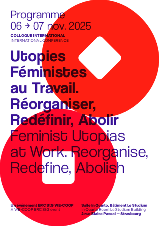 Invitation au colloque international « Utopies féministes au travail. Réorganiser, redéfinir, abolir », qui se tiendra les jeudi 6 et vendredi 7 novembre 2025 à l’Université de Strasbourg.