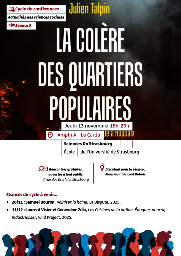 Ce jeudi 13 novembre de 18h à 20h nous accueillerons Julien Talpin qui présentera son livre LA COLÈRE DES QUARTIERS POPULAIRES dans le cadre du cycle de conférences Actualité des sciences sociales du master de Science politique.